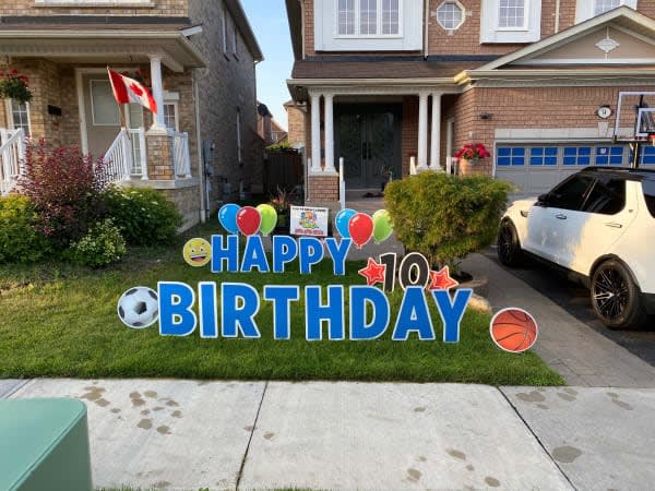 This Sports Themed Happy Birthday Card rental sign is great for kids & adults! There are endless ways to say Happy Birthday or any special message on the lawn with these colourful balloons. This theme can include your choice of Baseballs, Basket Balls, Footballs, Soccer Balls, or Hockey Players. We will customize the birthday persons name for you as well for $25!